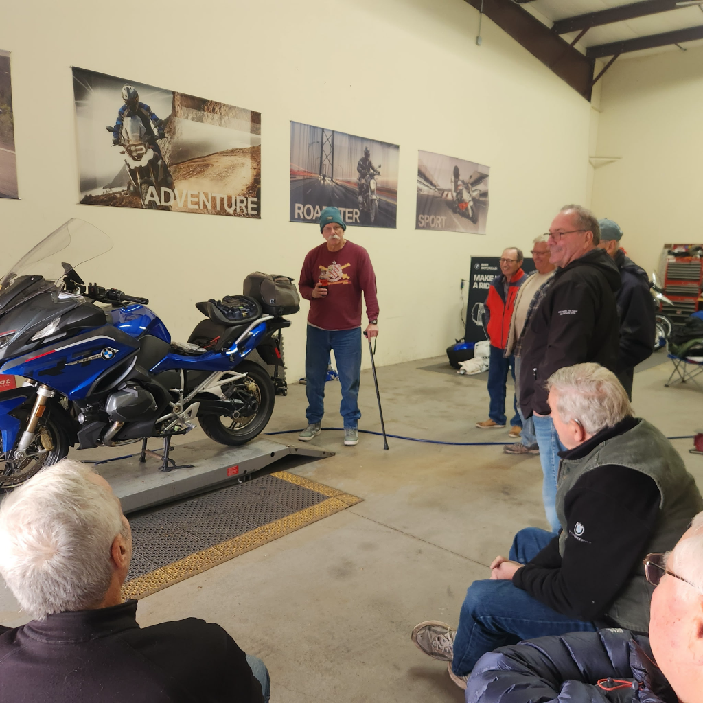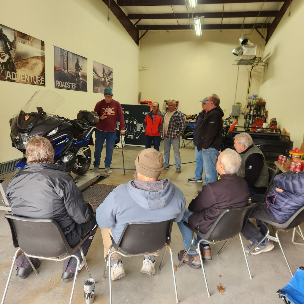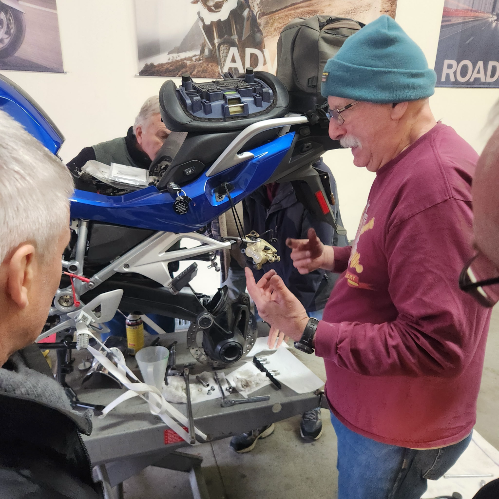 Stu Greene and John Schnabel held a Tech Day on Thursday, November 13 at John’s garage in Windsor Locks to show how to lubricate BMW motorcycle drive shaft splines. BMW is now requiring the drive shafts of 2014 bikes and later to be lubricated every 12,000 miles.
