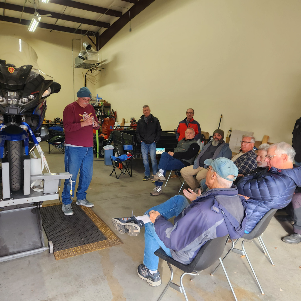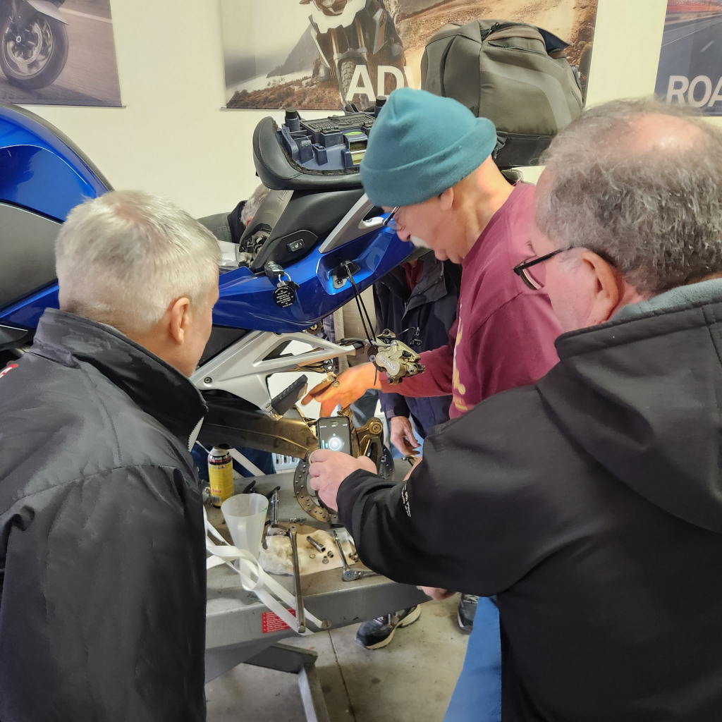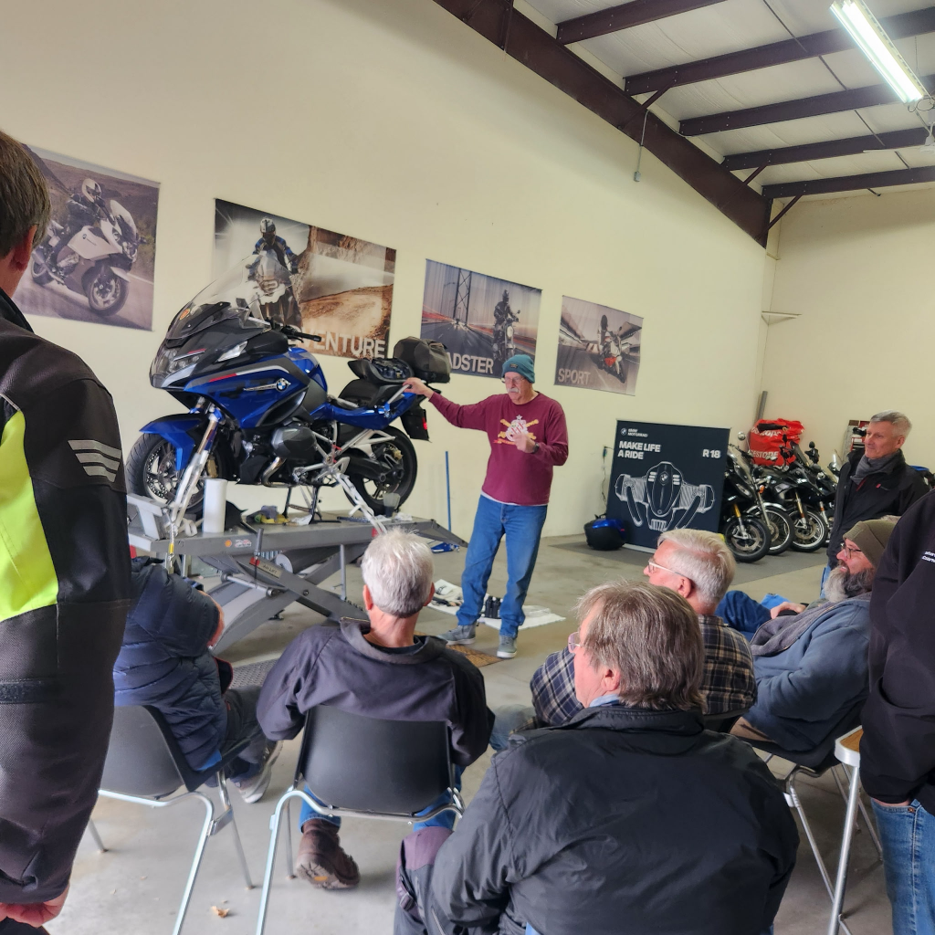 Stu Greene and John Schnabel held a Tech Day on Thursday, November 13 at John’s garage in Windsor Locks to show how to lubricate BMW motorcycle drive shaft splines. BMW is now requiring the drive shafts of 2014 bikes and later to be lubricated every 12,000 miles.